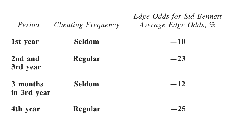 The data indicate that Sid doubles his losses when cheating. With his current losses in the Monday night game totaling $20,000 per year, his cheating costs him about $10,000 per year.