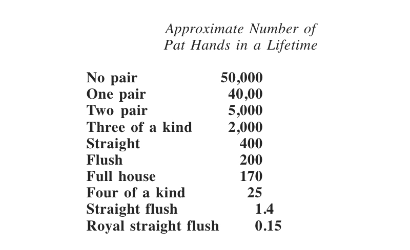 From this estimation, the number of pat (on the first five cards) poker hands that Sid should get during his lifetime is calculated from the card odds and tabulated below: