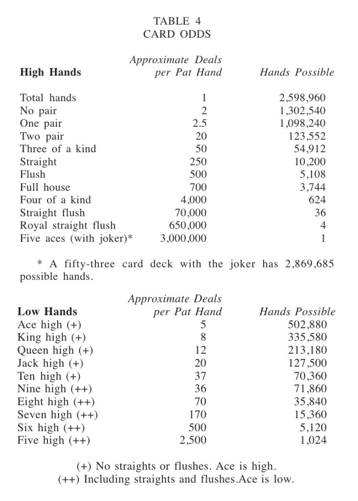 The card odds are the probabilities of being dealt or drawing to various hands. These odds are reviewed in most books about poker. Table 4 is based on the card odds and shows the statistical frequency with which different poker hands occur.