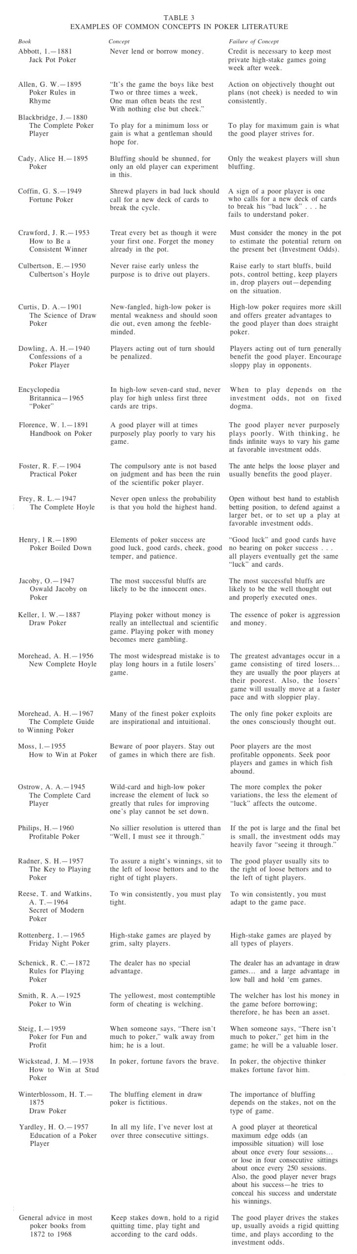 Table 3 identifies and analyzes the fallacies of many common concepts presented in the well-known and classic books on poker.