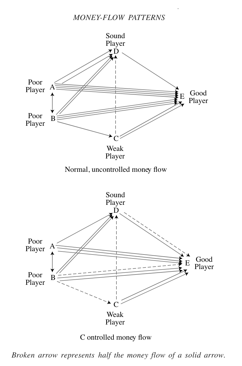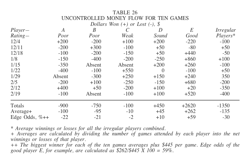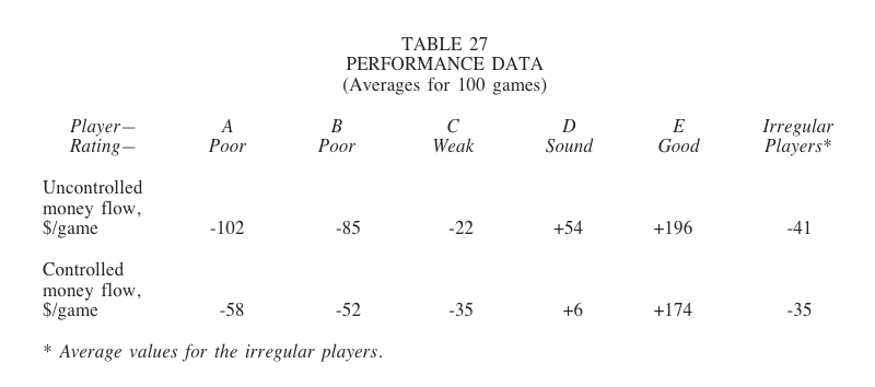 The good player evaluates the money-extraction patterns on both a short-term and a long-term basis. If a controlled pattern seems desirable, he then determines how the money flow should be altered (extent and direction). In a controlled pattern, he usually extracts money more evenly from his opponents … he extracts less from the poorer players and more from the better players. Controlled money flow shifts everyone’s performance, as shown in Table 27.