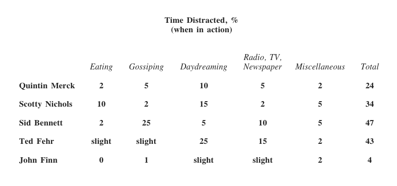 By using an array of distractions, John increases his edge odds by about 20 percent. That means $8000 additional income per year at his current winning rate. He estimates that while playing their hands, his opponents are distracted 35 percent of the time. And they are distracted a much higher percentage of the time when they are not involved in the action. The chart below estimates the in-action distractions of each player: