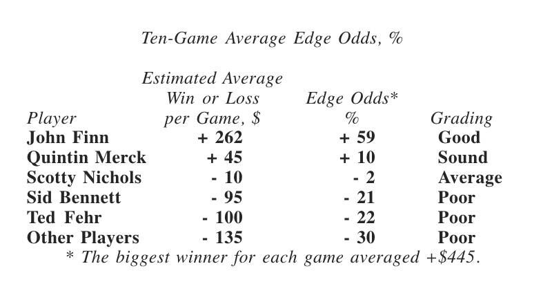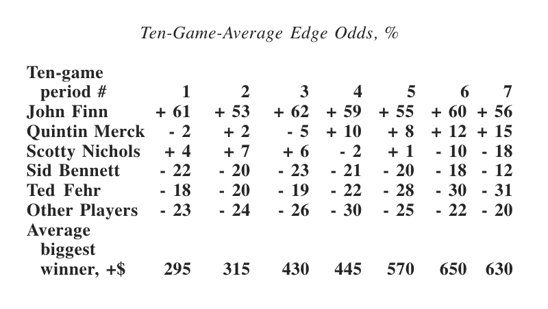 In a black leather notebook, John Finn keeps records of every player. After each game, he estimates their winnings and losses. After every ten games, he calculates their edge odds, as shown below: