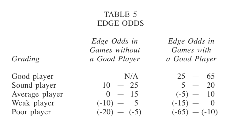 For example, if the biggest winner of each game averages plus $150, and if a player averages plus $75 per game, then the edge odds for this player are +75/150 x 100% = +50%. The more games used to calculate edge odds, the more significant they become. Edge odds based on ten or more games should reflect the relative performance of a player fairly accurately. The good poker player usually maintains edge odds ranging from 25 percent to 65 percent, depending on the game and abilities of the other players. An approximate performance grading of poker players based on the edge odds is tabulated in Table 5.