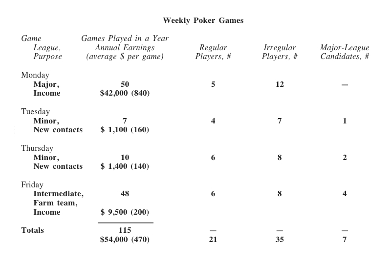 The following chart summarizes John Finn’s system of poker games for one year and his earnings from each game (for the final year for which his records were made available).
