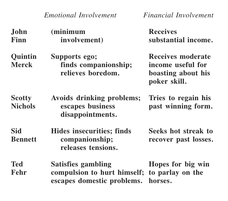 John Finn and Quintin Merck bet only when they judge the odds to be in their favor; they are not gamblers. But the other players in the Monday night game are gamblers…. Each one is emotionally and financially involved as shown in the following chart: