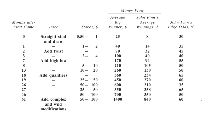 When John Finn started playing in the Monday night game, it was already seven years old and the stakes had been stabilized for five years. A dollar was the maximum bet, and only straight draw and stud games were allowed. The chart below shows how both the betting pace and stakes steadily increased after John took control of the game: