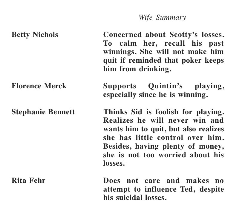 Although all poker players in the Monday night game view themselves as independent men, some of their wives retain various degrees of control over them. John plans his behavior toward their wives according to the following notations in his notebook: