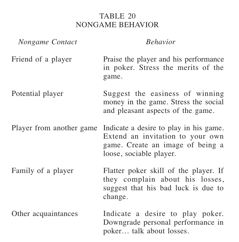 Table 20 shows ways the good player behaves toward nongame contacts that could influence his poker activities.