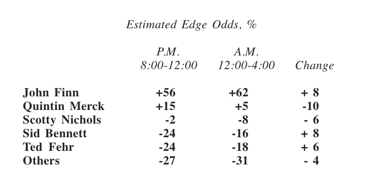 The data show that John’s edge odds increase by 6 percent after midnight. Also, the losing rates of poorer players (Sid and Ted) decrease at the expense of better players (Quintin and Scotty); that advantageous shift in money flow is accomplished without costing John money. In other words, John controls the money flow at lower costs during the late hours.