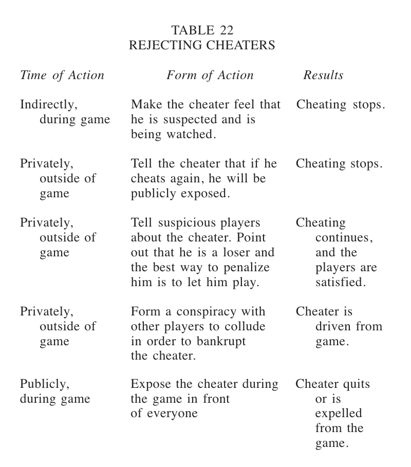 The best action against a cheater depends not only on the situation, but on the attitudes of the other players as well. If a cheater must be eliminated, the good player assumes a righteous hero’s role by exposing the “nefarious cheater.” That righteous role enhances the good player’s image of being the most honest and trustworthy player in the game— an ideal image for manipulating opponents.