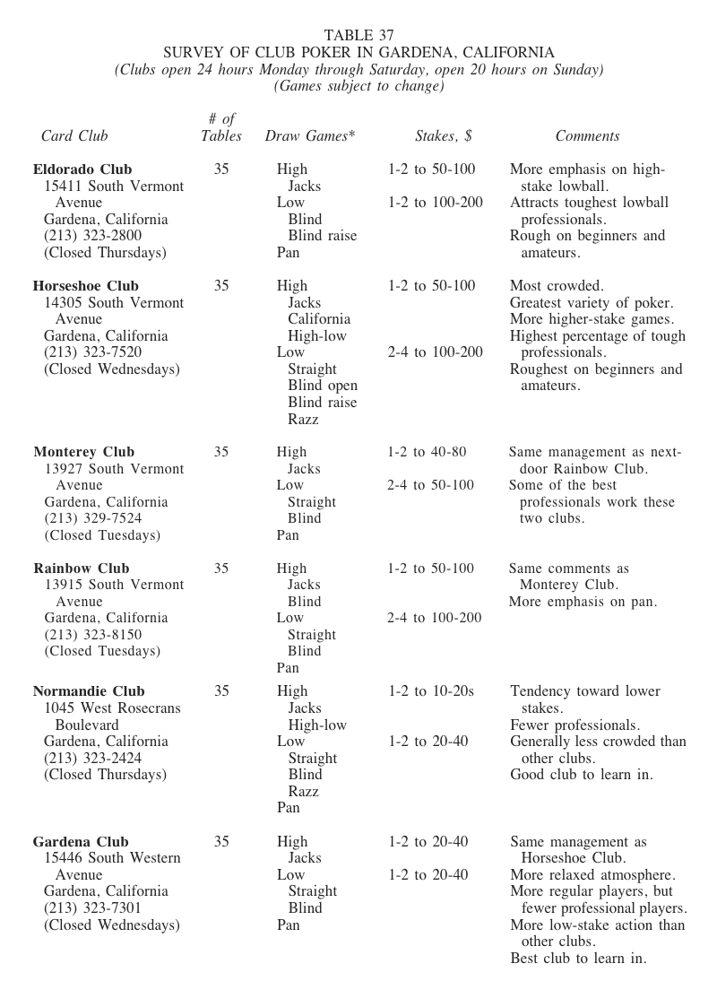Six commercial poker clubs in Gardena, California, are surveyed in Table 37. Those six clubs provide 210 poker and pan tables with 1680 seats. Throughout California, 400 licensed poker clubs have a potential capacity of 14,000 tables and 112,000 seats. State licensed poker parlors are also found in Montana, Oregon, Washington, and other states.