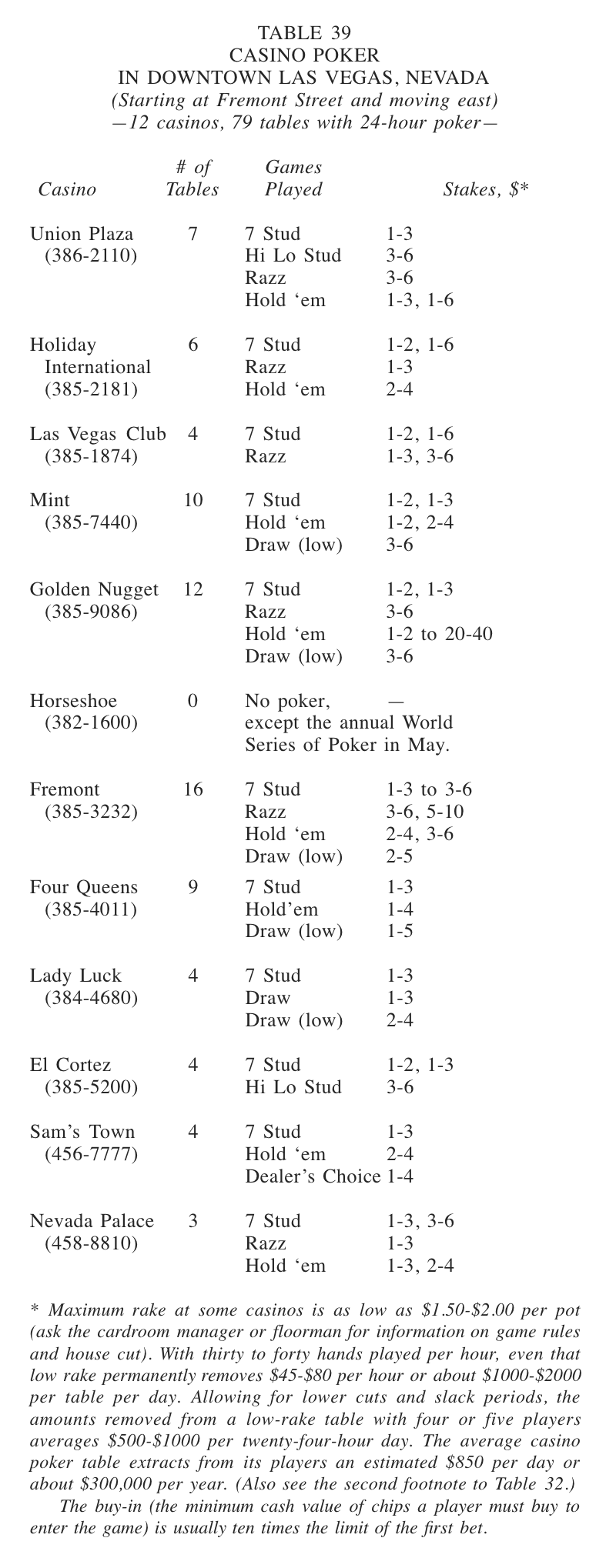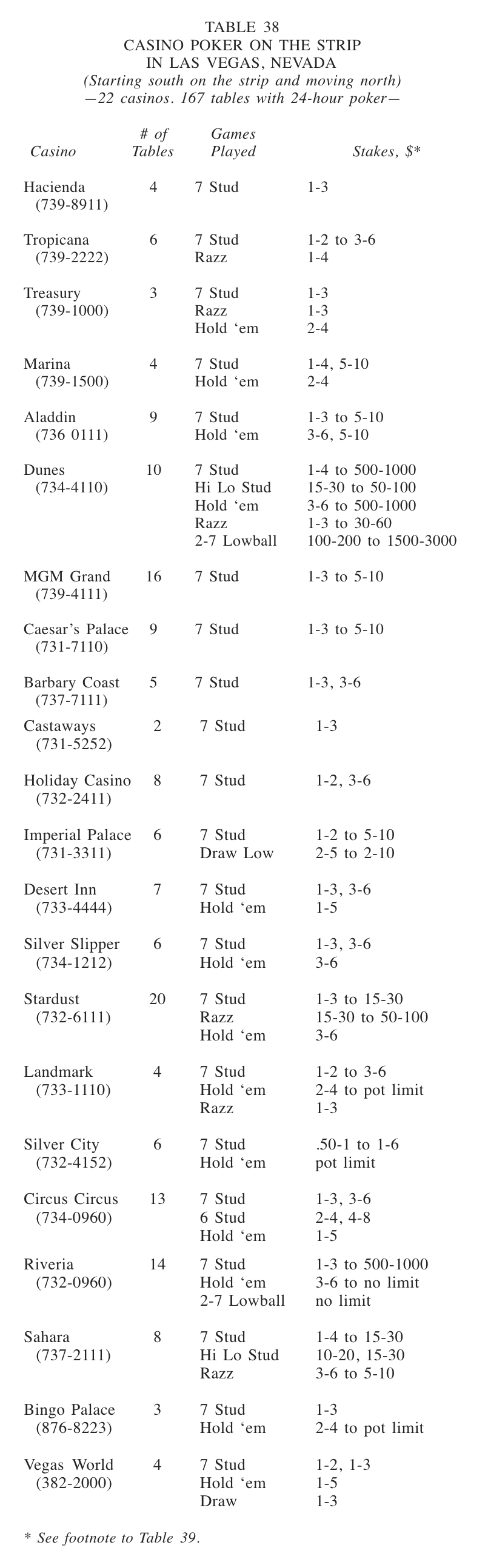 Thirty-three major casinos in Las Vegas, Nevada, are surveyed in Tables 38 and 39. The growing interest in public poker and the attractive profit margins possible from a well-run poker operation have caused sharp increases over the past few years in the number of poker tables in Nevada casinos. In addition to the more than thirty major poker rooms in Las Vegas, at least forty additional casino poker rooms exist in other cities and towns in Nevada. And major casino poker rooms are found in Reno at Cal Nev, Circus Circus, Harold’s Club Harrah’s, Horseshoe Club, MGM Grand, and Sahara Reno: and in Lake Tahoe at Park Tahoe and Sahara Tahoe.