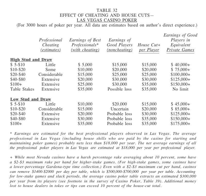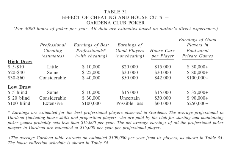 Still, how do the other poker players fare? If the average professional poker player in Gardena nets about $15,000 per year (estimated in footnote to Table 31), then the estimated 100 to 200 professionals in Gardena would extract $1,500,000 to $3,000,000 per year from all the other poker players. After allowing for those seats occupied by the professionals plus the empty seats and vacant tables during slack periods, the nonprofessional players occupy an estimated average of 800 seats in the six Gardena poker clubs. Those clubs, therefore, must extract $28,500 per year from each of these 800 seats to account for the $22,000,000 permanently removed each year. That means that the nonprofessional regular customer who plays forty hours per week must lose an average of $7000 per year if he plays better than half the other players in Gardena. (And, as a group, the Gardena players are the best and the toughest poker players in the world.) If he does not play better than half the players, he will lose more than $7000 per year by playing forty hours per week. If he is a much better player than the average Gardena player and can extract a net gain of $7000 per year from the other players, he will break even. And if he is good enough to extract a net gain of $22,000 per year from the other players by playing sixty hours every week, he will be in the same class with the average professional poker player by earning $15,000 per year. In other words, except for the few very best and toughest players, people pay dearly in both time and money for the privilege of playing poker regularly in Gardena. And as indicated in Table 32, players in the lower-stake games pay even more dearly for the privilege of playing poker regularly in Nevada casinos because of the higher percentage casino rake, but less dearly in most higher-stake games because of the lower percentage rake.