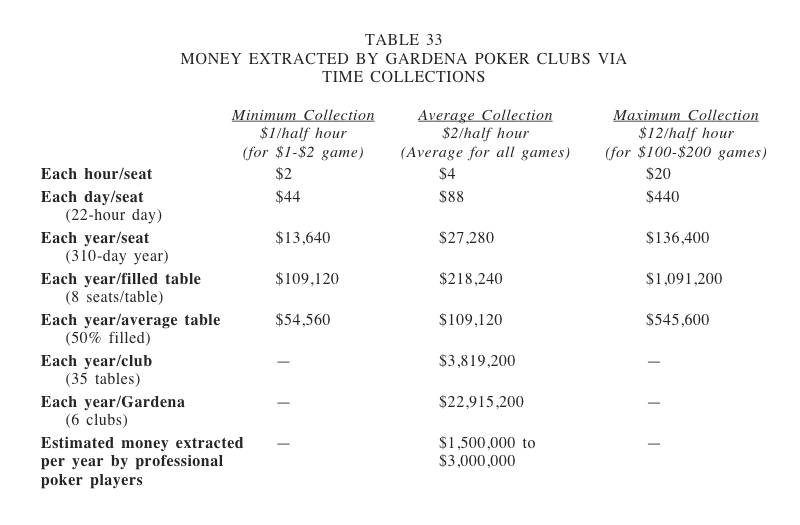 The time collections of public poker clubs (e.g., Gardena, California poker club30) are generally less expensive and less harmful to the good player’s earnings than are the percentage rakes of Nevada casinos.31 Still, the Gardena-type time collections relentlessly and permanently remove the major portion of available cash from every game. Table 33 shows that each year, the six Gardena clubs end up with more than ten times the cash that is won by all the professional poker players in Gardena combined. The table shows that the six Gardena poker clubs extract over $22,000,000 per year from their customers.
