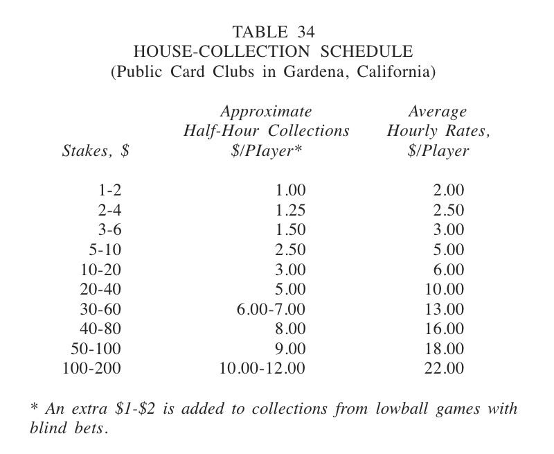 31Some Nevada casinos are switching from harsh percentage rakes to milder, Gardena-type time collections, especially for their higher stake games. Increasing competition for poker players is causing this trend toward milder house cuts as more and more Nevada casinos, attracted by the profitability of public poker, are adding poker to their operations or are expanding their existing poker facilities. In fact, the maximum rake for some high-stake casino games has fallen below $2.00 per hand, reducing the house cut to well below 5%. But the competition in those games is much stiffer since the best players and professionals gravitate to the low-cut games. But countering the trend toward lower rakes in Nevada casinos, the California card clubs are raising their collection fees as shown in Table 34.